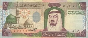 I spent a few months in Saudi Arabia as part of Desert Storm. Here's a hundred riyal note. Can't remember what the exchange rate was offhand, but I didn't have much call to go out sight-seeing in Riyadh, either. |